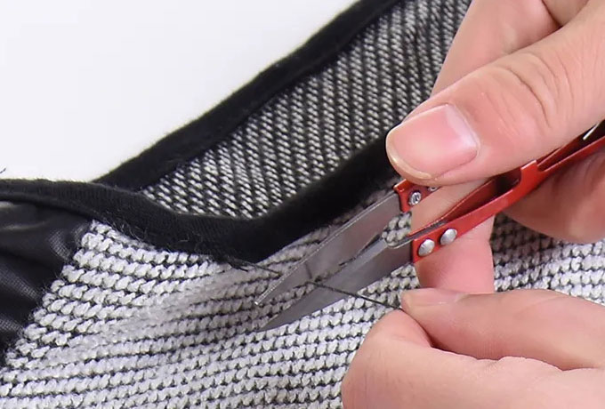 To give the workout clothing a clean and durable finish, our workers trim the threads and the fabric with precision cutting tools.